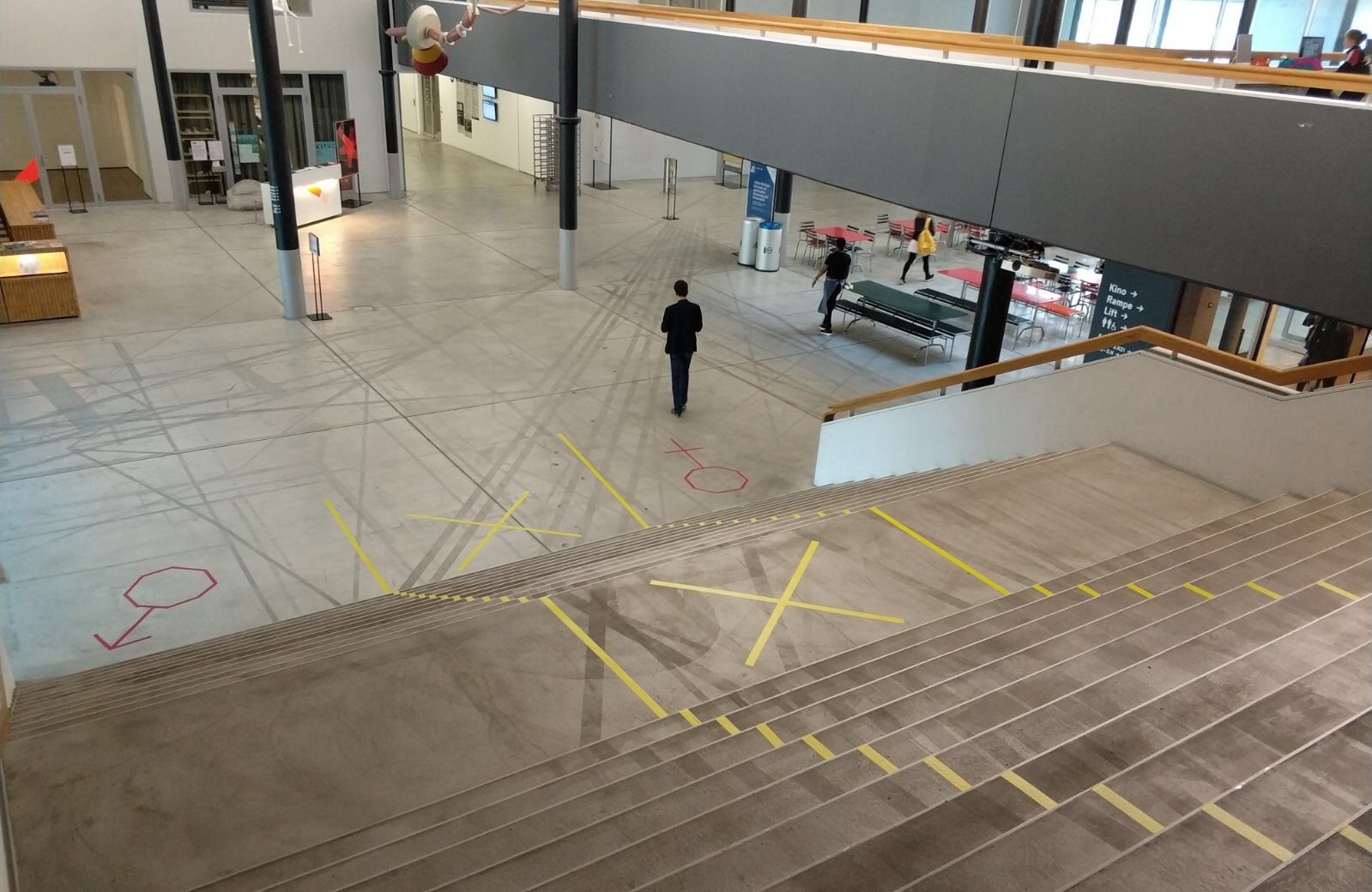 We made a mark on two different stairs in the school and expected to see how people react to it later. On the stairs outside the school, the stripe was tied with a strange Z shape, deliberately giving way to people to take a detour.On the stairs in the school, the stairs were divided into three blocks: male, female and something in between.
